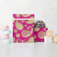 Verpackungspapier in einem verzierten Paisley-Muster in den Steigungen des Goldes mit einem metallischen Blick des Imitats, auf einem tiefen pinkfarbenen rosa Hintergrund