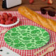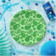 Papier-Teller in einem verzierten Paisley-Muster in den Farbtönen Chartreuse bis Smaragdgrün auf einem pastellfarbenen, grünen Hintergrund