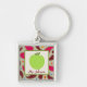 Ein Schlüsselanhänger, der einen Hintergrund von Paisley kennzeichnet.  Grüne Apfelillustration innerhalb des Quadrats in der Mitte.  Personifizieren Sie mit Ihrem Namen.