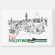 Traditionelle palästinensische Zuhause stehen stolz und symbolisieren das fortwährende Erbe und die standhafte Hoffnung auf Rückkehr, wobei die Worte "Palästina besuchen" neben der palästinensischen Flagge zu sehen sind.