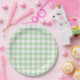Ändern Sie die hellgrüne Hintergrundfarbe hinter dem nahtlosen Fliesen Gingham Schachbrettmuster. Fügen Sie Text hinzu, um Ihre eigenen personalisierten Teller zu erstellen. Das traditionelle Gingham-Muster verleiht jedem Event eine Touch von Charme und Nostalgie. Diese Teller eignen sich hervorragend für eine Babydusche, ein Wiedersehen-Picknick, Grillabende oder jede Ansammlung im Freien, wo eine lässige und fröhliche Atmosphäre gewünscht wird. Sie können auch in eine Vintage oder landesweit inspirierte Hochzeit eingebunden werden.