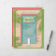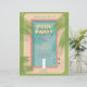 Der Pool Party Flyer mit einem illustrierten Swimmingpool im modernen Stil der Mitte des Jahrhunderts. Zu den Designs zählen Blues, Pinks, Palmenfronten, Swimmingpool und Retro-Design.