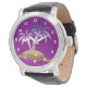 Wenn Sie den Komfort des Strandes Liebe haben, werden Sie diese Designer-Uhren mit einem farbenfrohen Palmen-Strand-Design mit einem lila Hintergrund Liebe finden.