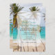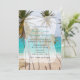 Tropisch inspiriert Verpflichtungserklärung Einladung, mit einem Foto von Palmen am Strand. Ein halbtransparenter Klammer formatierter Textbereich hat einen eigenen Text, der für Ihren speziellen Tag personalisiert werden kann.