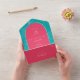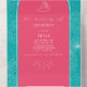 Eine Kunstdarstellung mit weißer Linie von Palm-Blätter über blauem Hintergrund mit weißem Text und Muscheldesign über rosa Bogen mit weißem Rand. Draußen ist pink mit Rücksendeadresse und Palmblattbild auf Klappe. UAwg enthält qr-Code und traditionelles Format.