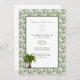Ein wunderschöner Rahmen aus grünen, rosa und Aquamarinen Palmen Blätter mit einer dunkelgrünen Kontur und grünem Text für Ihre tropische Hochzeit auf einer Insel in der Sonne