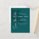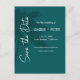 Diese Save the Date Postkarte zeigt eine aquamarine Typografie auf der Silhouette einer Palme für eine moderne und minimalistische Save the Date Postkarte für Ihre kommende Hochzeit. Der gesamte Text ist für Ihre personalisierten Anforderungen editierbar.
