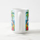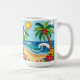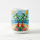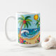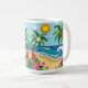 A coastal Coffee Mug in a paper quilling style ai illustration of two palm trees, the sun, ocean waves, a beach and tropical flowers.