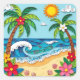 A coastal sticker in a paper quilling style ai illustration of two palm trees, the sun, ocean waves, a beach and tropical flowers.