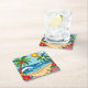 A coastal Coaster in a paper quilling style ai illustration of two palm trees, the sun, ocean waves, a beach and tropical flowers.