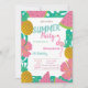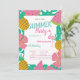 Diese Einladungen sind mit Blätter aus Palmen mit tropischen Früchten und rosa Flamingo auf blauem Hintergrund gestaltet. Diese Einladung ist einfach an Ihre Veranstaltung angepasst, indem Sie einfach Ihre Details hinzufügen.