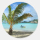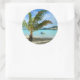 Rund um den Souveniraufkleber einer Palme am Sandstrand eines Luxus-Überwasser-Hochzeitsurorts auf der tropischen Insel Bora Bora, in der Nähe von Tahiti im pazifischen Archipel Französisch-Polynesien.