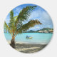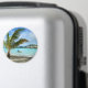 Rundherum Andenken Foto Magnet einer Palme auf Sand-Strand eines Luxus-Überwasser-Dach-Flitterwochen Resort auf der tropischen Insel Bora Bora, in der Nähe von Tahiti in der pazifischen Archipel Französisch Polynesien.