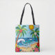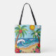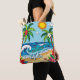 Eine personalisierte Tote-Tasche an der Küste in einem Papierquilling Stil ai Illustration von zwei Palmen, die Sonne, Ozeanwellen, ein Strand und tropische Blume.