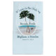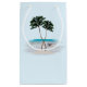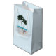 Geschlossene Palmen Papier Hochzeitstaschen mit Text. Herzlich willkommen bei einer tropischen Hochzeit in Urlaubsort mit Taschen voller Goodies. Wählen Sie die kleine oder mittlere Größe nur für den passenden Text. Blassblaue Taschen mit Streichgriffen haben Palmen und Stranddesign auf der Vorderseite. Passen Sie den Text mit Ort, Namen der Braut und Bräutigam und Datum der Hochzeit an.