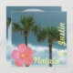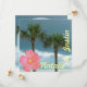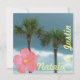 Tropischer Strand Save the Date mit Palmen, korallenrosa Hibiskus und feiner Text. Die perfekte Art, eine bevorstehende Hochzeit in Urlaubsort am Meer zu verkünden.