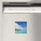 Souvenir Foto Magnet einer kleinen Insel mit einer Palme in der türkisfarbenen Lagune der tropischen Insel Bora Bora bei Tahiti in Französisch-Polynesien.