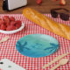 Papier Teller für eine tropische Hochzeit mit einigen blauen Palmen Silhouetten auf einem aquablauen Hintergrund, der ein tropisches Meer darstellt. In der Mitte befinden sich individuell anpassbare Textfelder für die Namen des Paares und für das Datum der Hochzeit.