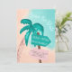 Palmbaumpfeil blau tropisch Save the Date, Ein niedliches und lustiges handgezeichnetes Palmenstrand Holzschild mit einem rosa und aquamarinen Holz Pfeil-Illustrationszeichen in einer modernen Typografie.