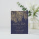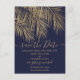 Moderne Goldpalme elegant Save the Date. Moderne, einfache Imitate Goldpalme mit einfacher Typografie, ein trendiges und Save the Date tropisches Hochzeitstil auf Palmenblättern mit essbarem Marineblau.