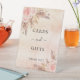 Ein rustikal rot rosa, Rose goldener Farbverlauf Hintergrund. Die Einrichtung ist mit Rose-Gold und rosa Blumen, Rose und Pampas-Gras dekoriert. Mit dem Text: Karten und Geschenke, vielen Dank