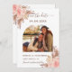 Eine moderne Hochzeit Save the Date Foto Karte. Die Einrichtung besteht aus goldfarbenen Blüten in Rosa und Rose und Pampasgras. Personalisieren Sie Ihre Foto- und Hochzeitsdetails und fügen Sie diese hinzu.