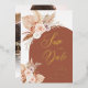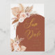 Ankündigung an Ihre Freunde und Liebsten Ihr Hochzeitstag in einem eleganten Fall terracotta bohemian themed Hochzeit speichern Sie die Dattelkarten mit einer Folie kalligraphische Schrift mit handgezeichnet Aquarell gedämpfte Rosa, lila-weiß getrocknete Rose, Pampas Gras und Palmenblatt mit Terracotta Bogen. Sie können auch ein eigenes Foto auf der Rückseite platzieren. (Foto Credits für Junior Reis von Unsplash.)
