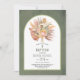 Tropisch getrocknete Palmen Blätter, Pampas Gras und Protea Blume graue grüne Bogen Taufe Einladung. Dieses hübsche Design zeigt einen Bogenrahmen auf graugrünem Hintergrund. Im Rahmen befindet sich ein Aquarellbouquet mit Blätter aus getrockneten Palmen, Protea-Blume und Pampas-Gras.