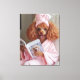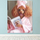 Ein hyper-realistisches Bild eines charmanten Poodle, der sich in einem rosa Bademantel entspannt und mit einem passenden Handtuch umhüllt. Der bezaubernde Hund sitzt bequem auf einem Stuhl und hält ein Magazin mit einem anderen Poodle auf dem Cover. Der spielerische Charakter und das luxuriöse Ambiente des Wellness-Centers machen diese Szene niedlich und amüsant.