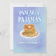 Fun Pancakes und Pajamas Thema Geburtstagsfeier Einladung Vorlage Karte mit einer Abbildung eines Stapels von Pfannkuchen mit Butter und Ahornsirup. Dieses farbenfrohe Motiv lädt ein zu einem leckeren Party oder zum Frühstück.