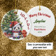 An der Vorderseite dieses Holiday-Ornament befindet sich ein bezaubernder Panda-Bär, der eine rot-weiße Weihnachtsmannmütze trägt. Der Bär sitzt vor einem verzierten Holiday-Baum und ist in eine Reihe von festlichen Lichtern eingewickelt. Roter Text an der Seite sagt "JOYFUL". Auf der Rückseite steht rot und grün "MERRY CHRISTMAS", und es gibt zusätzliche Textfelder, die Sie anpassen können. Wunderbar, um eine Enkelin, Enkel, Tochter oder Sohn zu geben.