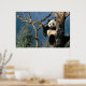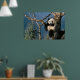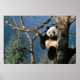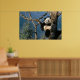 Ein Panda In einem Baumposter.hat einen schwarz-weißen Panda, der oben auf einem Baum sitzt, mit einem Wald hinter ihm und einem blauen Himmel.Dies ist ein schönes Foto.