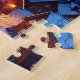Panoramic stained glass winter village, glowing house windows, snow-covered rooftops, twilight blue sky with auroras, warm Christmas feel, detailed yet soft glass texture