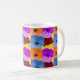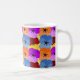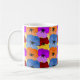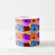 Diese Tasse hat ein lila, blaues, orangefarbenes und rotes Frühjahrsdesign mit gelben Stiefmütterchen, die auf einem Gelbfeld angeordnet sind.