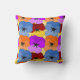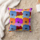 Dieses Kissen hat ein lila, blaues, orangefarbenes und rotes Frühjahrsdesign mit gelben Stiefmütterchen, die auf einem Gelbfeld verlegt sind.
