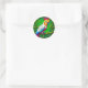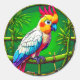 Farbenfroher Papagei auf einem Bambuszweig, Set vor einem lebendigen grünen Hintergrund. Der Papagei hat einen auffallenden Absturz mit einer Mischung aus weißen, orangefarbenen, rosa und blauen Federn. Sein Kopf zeigt ein helles orangefarbenes Wappen, das durch große, runde Augen hervorgehoben wird. Um den Papagei herum gibt es mehrere Bambusfische, die zu einer exotischen tropischen Atmosphäre beitragen. Das Design ist gewagt und grafisch, sodass der Papagei fast kartoonisch und lebendig erscheint.