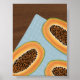 Eine lebendige Abbildung mit frischen Papaya-Hälften mit fett orangefarbenem Fleisch und dunklen Samen, die auf einem cool blauen Gittertuch auf warmen braunen Hintergrund angebracht sind. Dieses tropische Design bringt eine Touch von Inselvibes und boho Charme zu jedem Raum. Ideal für Küchenwandkunst, Fruchtdrucke, SommerSchreibwaren oder Zuhause-Dekorgegenstände. Ein erfrischendes Kunstwerk für diejenigen, die farbenfrohe moderne Kunst mit einer tropischen Drehung Liebe.