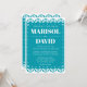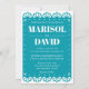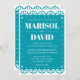Eine wunderschöne papel picado Stil Hochzeitseinladung auf einem aquamarinen blauen Hintergrund. Auf der Rückseite befindet sich ein Taubendesign mit den Initialen des Paares. Ideal für eine traditionelle oder moderne mexikanische Hochzeit.