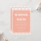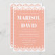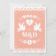 Eine schöne papel picado Stil Hochzeitseinladung auf einem rot-rosa Hintergrund. Auf der Rückseite befindet sich ein Taubendesign mit den Initialen des Paares. Ideal für eine traditionelle oder moderne mexikanische Hochzeit.