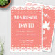 Eine schöne papel picado Stil Hochzeitseinladung auf einem korallenrosa Hintergrund. Auf der Rückseite befindet sich ein Taubendesign mit den Initialen des Paares. Ideal für eine traditionelle oder moderne mexikanische Hochzeit.