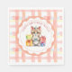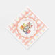 Adorable personalisiert Happy Birthday kitten Thema Papierservietten mit einem süßen Aquarell Kätzchen mit einem Kuchen umgeben von Geburtstagsgeschenken. Charmanter korallenfarbener karierter Hintergrund.