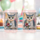 Playful and unique paper owl with pocket watch soda glass, fun conversation piece for soda party or friendly gathering.