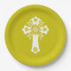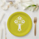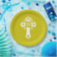 Yellow paper plates with a white floral cross. Part of the Floral Cross Christening Collection.