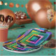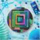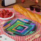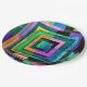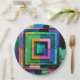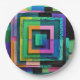 A geometric design composed of colorful square shapes covers this paper plate.