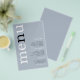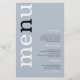 PAPER Dusty BlueTypografy Wedding Menu. PAPER (nicht Karte) Alternative in Größe 5,5" x 8,5". Modernes Typografie-Design mit Menu in großer Typografie in Weiß mit dem "n" in schwarz rotiert und auf links Seite auf einem Hintergrund staubblauer.