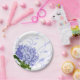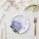 Teller aus Party in weißer Dessertgröße mit Kunstdruck in einem hübschen Single-Hydrangea-Design. Wir bieten eine Serviette, die zu dieser Papiertafel passt. Passen Sie dieses Objekt an oder kaufen Sie, wie es ist. Bild