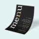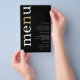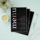 PAPER Simple White Gold Typografy Black Wedding Menü. Ein PAPER (nicht Karten) mit großem Wert Alternative im Format 5.5" x 8.5". Ein stilvolles typografisches Design mit Menu in großer Typografie in Weiß mit dem "n" in Gold gedreht und auf schwarzem Hintergrund auf der links Seite.