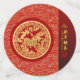 Ein elegantes visuelle eines goldenen oder roten Pferdes mit Blüten zu einem Kreis (inspiriert durch traditionelles chinesisches Papier-Schnitt) mit rotem oder goldenem Kreis überlagert ein rotes und gelbes, traditionelles asiatisches Muster + grafische "GLÜCKLICHES NEUES JAHR" in Chinesisch und Englisch und alte chinesische Kalligraphie für "Pferd" auf der rechten Seite auf gradiant roten Farbband für die großen Konfetti. Design auf Party Papier Konfetti. Passende Grußkarte, Ferienpostkarte, quadratische Flachkarte, runde Flachkarte, vertikale Flachkarte und mehr bald.