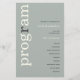 Paper Simple Sage Elfenbeintext Hochzeitsprogramm. Ein großes Preis-Leistungs-Verhältnis PAPER (nicht Karte) Alternative zu einem günstigen Preis. Modernes typografisches Design mit Programm in großer Typografie in Elfenbein mit dem "r" in Grau, rotiert und auf der links Seite auf einem Hintergrund von hellgrünen Salbei. Hintergrund- und Textfarben können auf Wunsch über Weitere Anpassungen geändert werden.