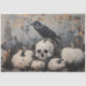 Spookes Ölgemälde decouptenes Gewebepapier mit einem raven auf einem Schädel und umgeben von weißen Kürbissen. Die Ölmalerei verleiht den decouponierten Möbeln und Halloween-Wohngestaltung einen rustikalen Charme.